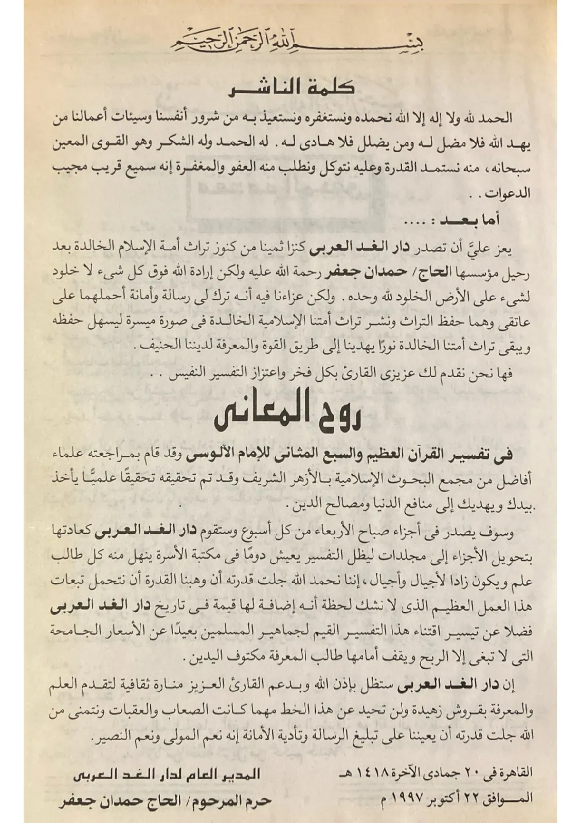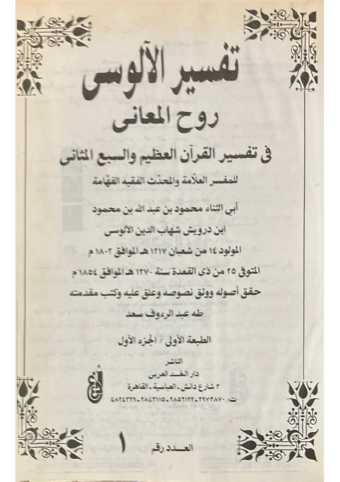 هذا التفسير ليس مجرد كتاب بل هو نافذة لفهم النصوص المقدسة بعيون العلّامة الألوسي. وهو مثالي للراغبين في الغوص في تفاصيل المعاني القرآنية والاستفادة من فكر تحليلي متوازن يعكس روح الإسلام.